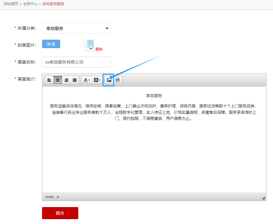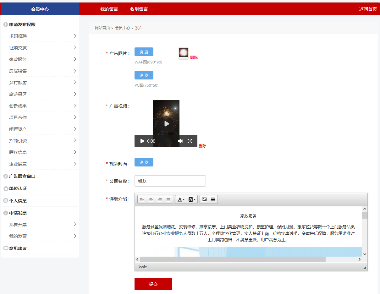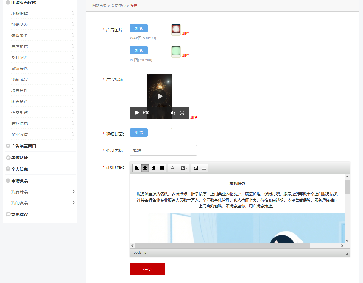 5.在我的广告页面,点击我购买的服务,进入广告信息展宣发布页面,依次上传填写您的广告展宣信息详情,其中广告图片要上传两张,wap端即手机端上传图片尺寸为690*90,PC端即电脑端上传图片尺寸为750*60,上传后的图片、视频可以点击删除按钮进行删除,详细介绍中可以进行文字+图片的上传您可自主进行排版设计,其中要注意图片上传的步骤以下有详细示例,上传完成后点击确认发布,显示操作成功后即成功共发布您的广告展宣信息