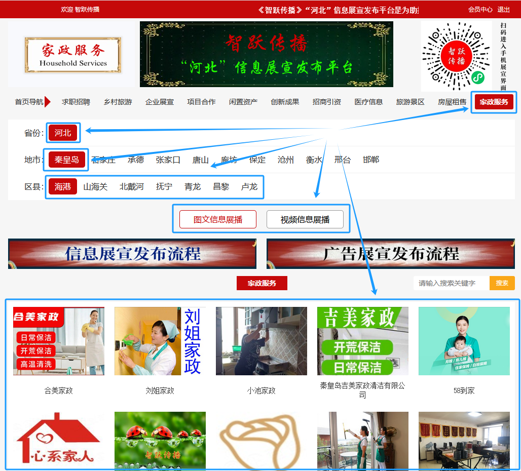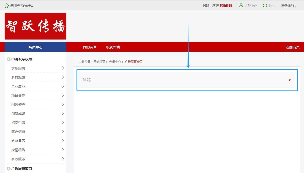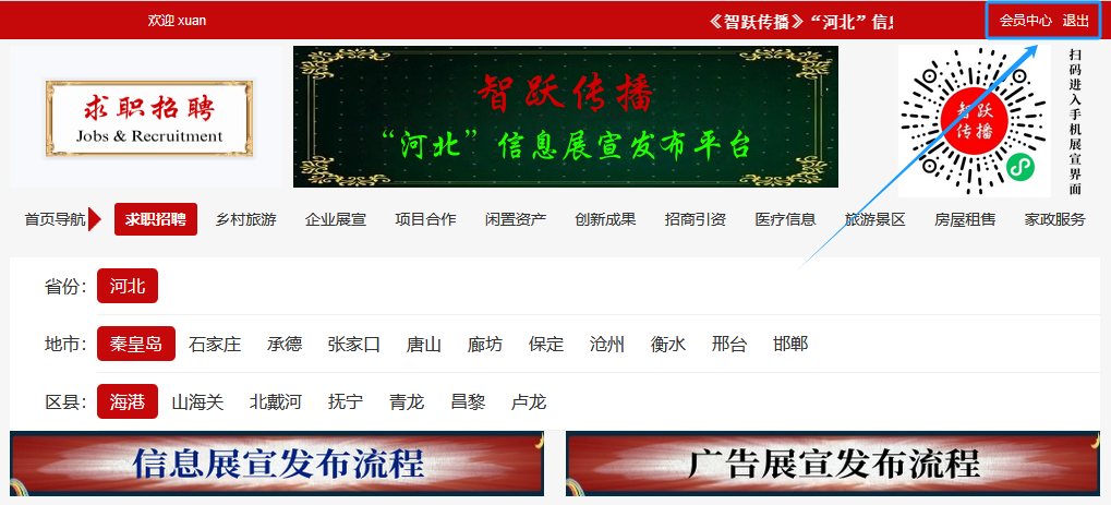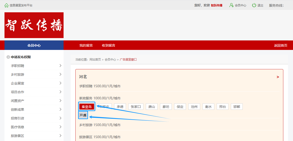 2.进入会员中心页面后,点击左下方广告展宣窗口,以下以河北省秦皇岛市的家政服务窗口的广告信息展宣为例,首先选择您要宣传的省