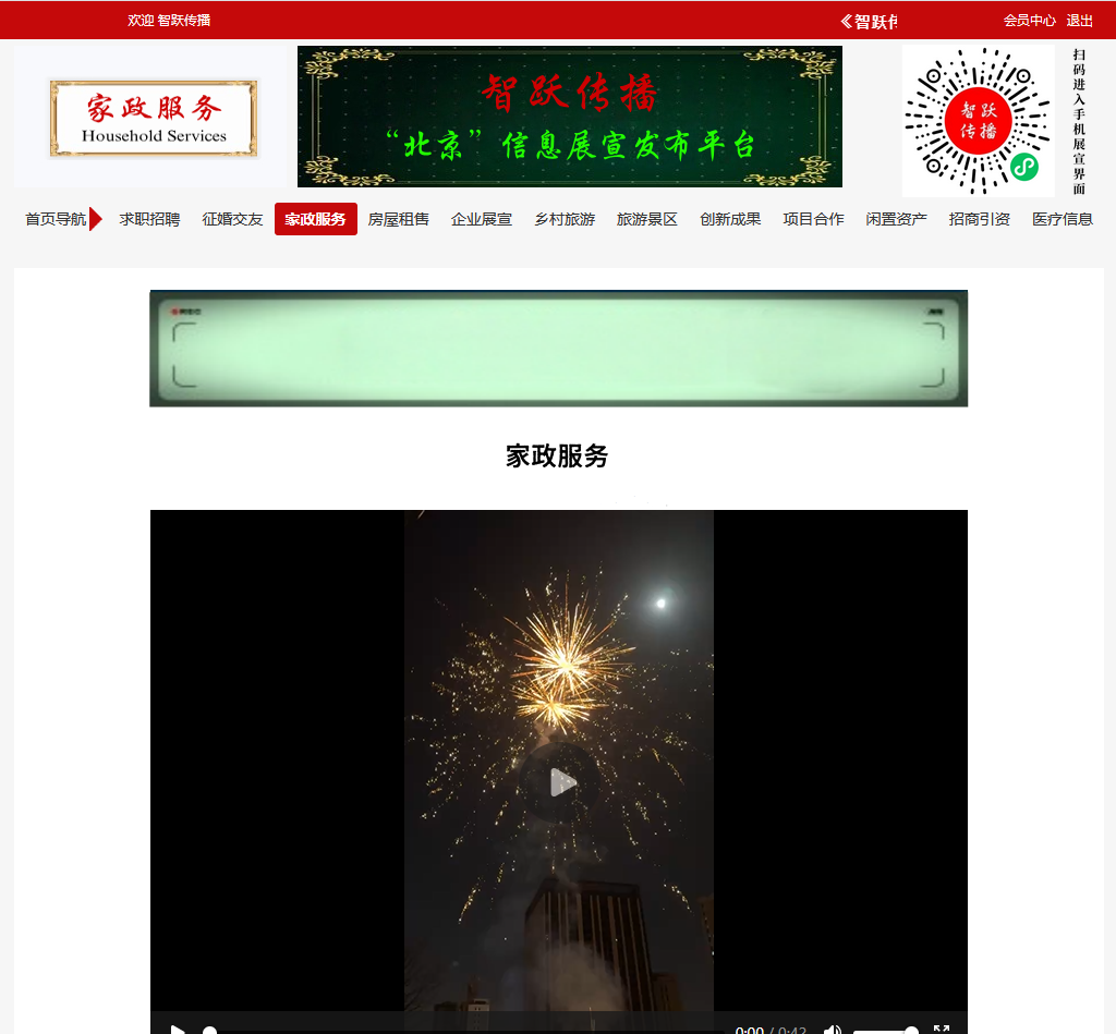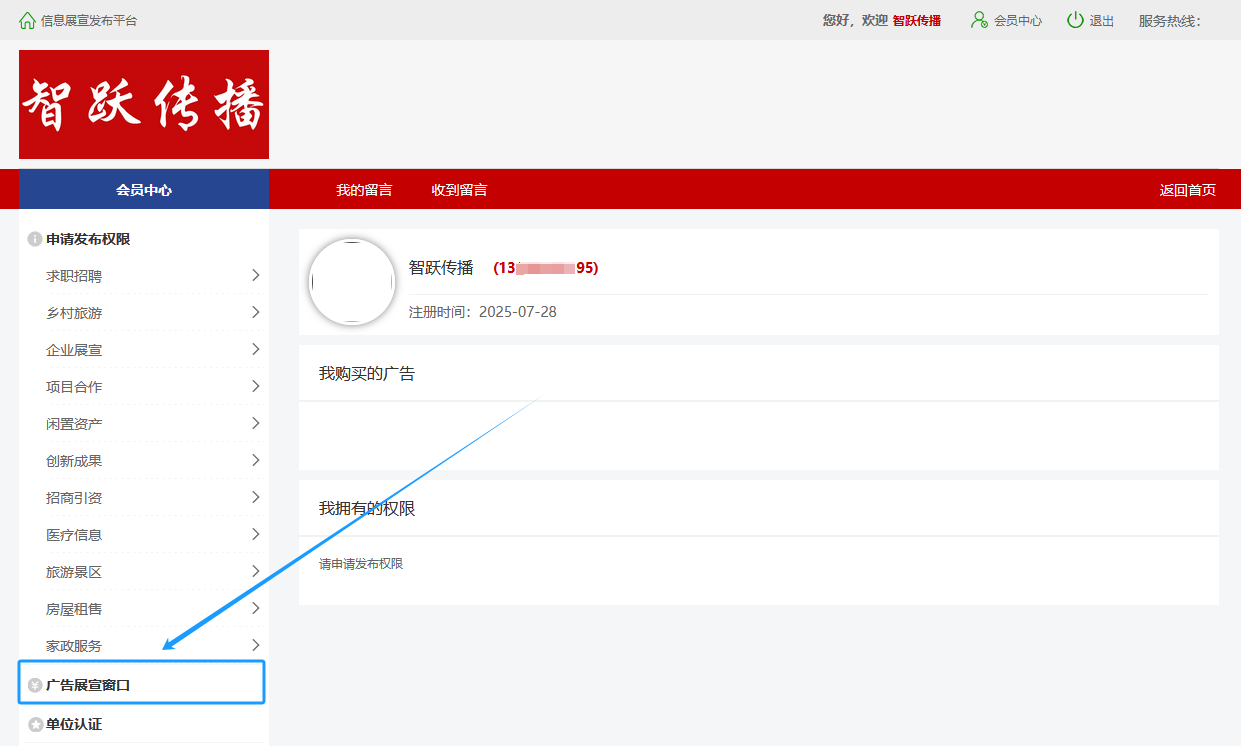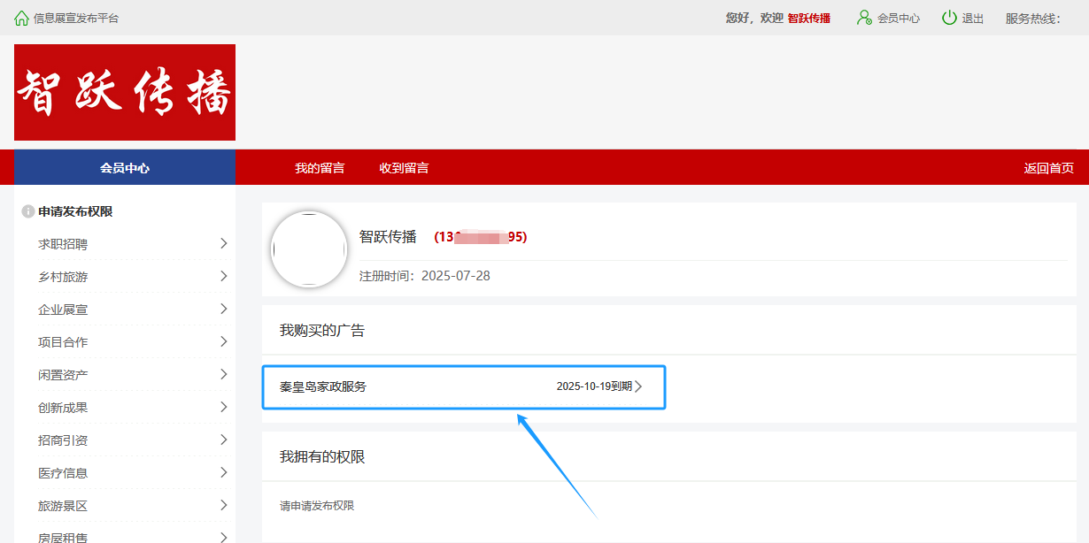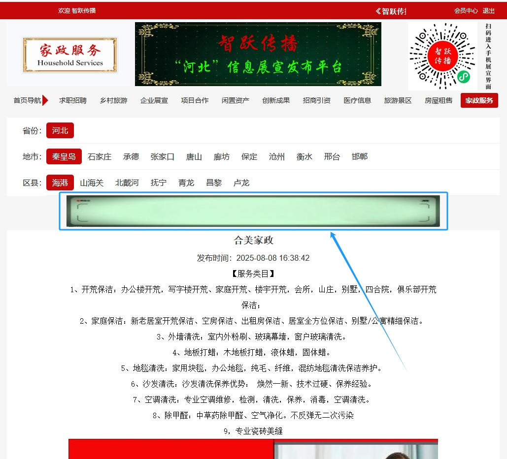 2.进入会员中心页面后,点击左下方广告展宣窗口,以下以河北省秦皇岛市的家政服务窗口的广告信息展宣为例,首先选择您要宣传的省