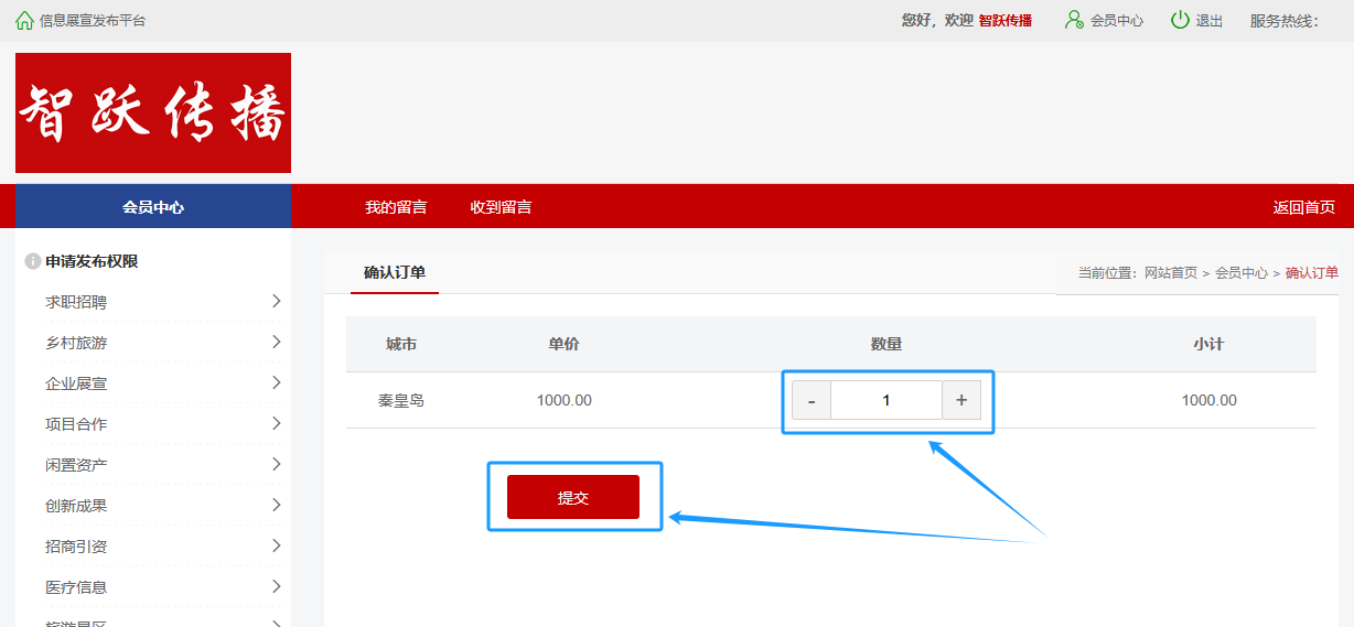 1.用户登录、认证后点击右上方会员中心,进入会员中心页面
