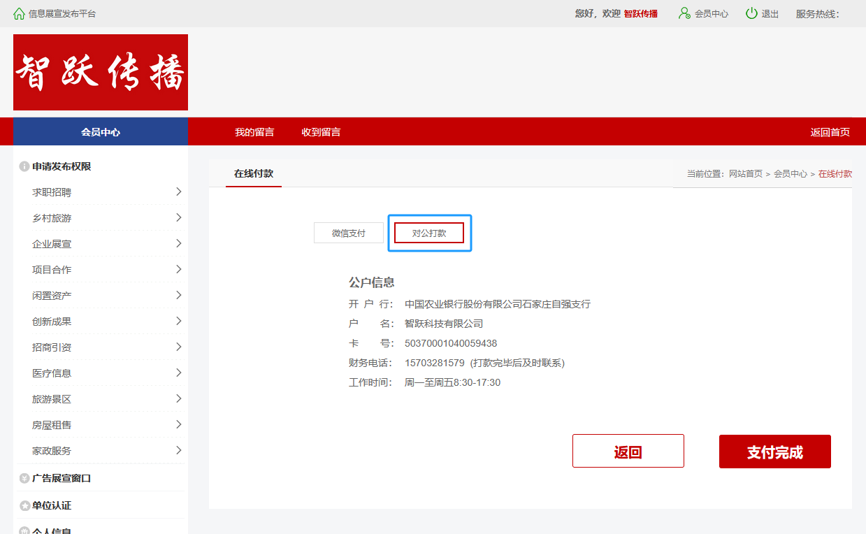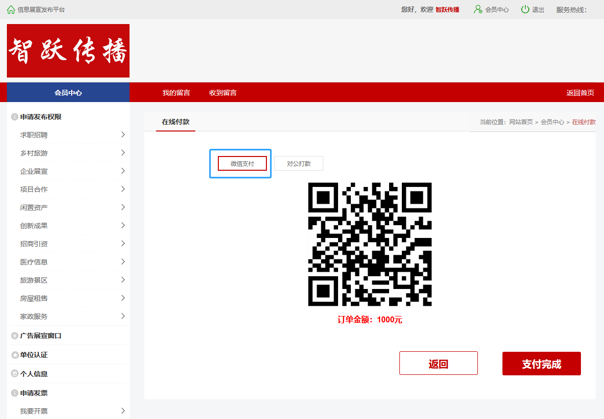 4.点击开通后进行展宣时长的选择展宣时长以月为单位,选择好后点击提交,支付时有两种方式微信支付和对公打款,如您选择对公打款请您打款后及时联系平台客户确认订单,支付成功即开通成功,可在会员中心,我的广告页面看到我购买的服务。
