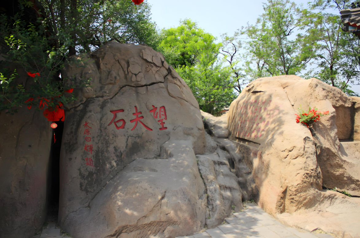 后殿;额枋上挂“慈航普渡”横匾一块。殿内正中塑观音、文殊、普贤三大士像。观音面容慈祥,身着长衣,双手合十盘膝于莲花宝座上。两旁男女小童侍立左右。后殿之后,有大石一块,上面有几个石窝窝,传说是孟姜女登石望夫留下的脚印,石上刻有“望夫石”三个大字,为顺治八年山石道白辉所书。望夫石旁有一个小平台,是传说中的姜女梳妆台 。