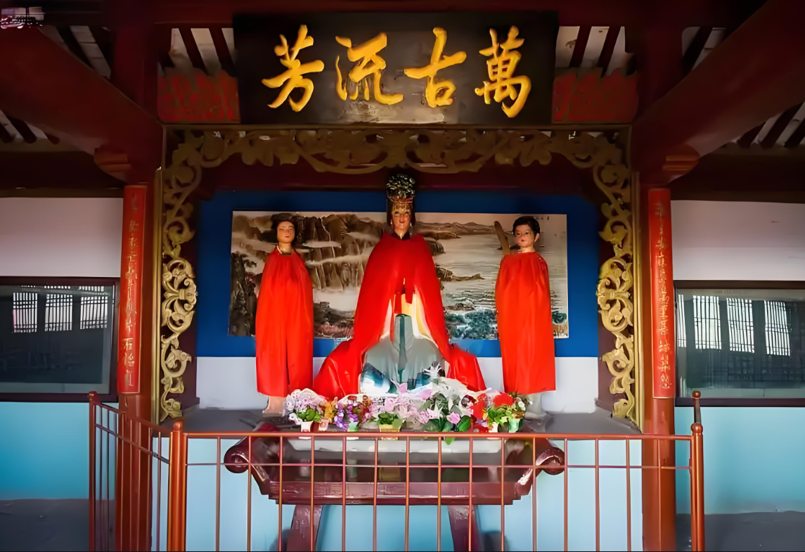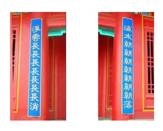 前殿大门有一副情趣盎然的对联:“海水朝朝朝朝朝朝朝落,浮云长长长长长长长消”,这副对联虽然表面看是文字游戏,却包含着人生哲理,被称为“天下第一奇联”。前殿神龛两旁还有一副楹联:“秦皇安在哉,万里长城筑怨。姜女未亡了,千秋片石铭贞” 。